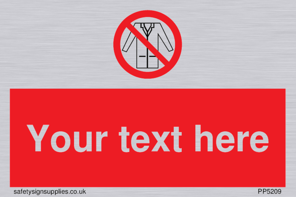 This sign contains a no lab coats symbol, lab coat outline with red prohibition circle with diagonal line crossed through.