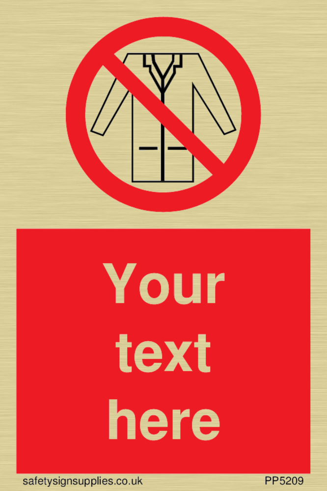 This sign contains a no lab coats symbol, lab coat outline with red prohibition circle with diagonal line crossed through.