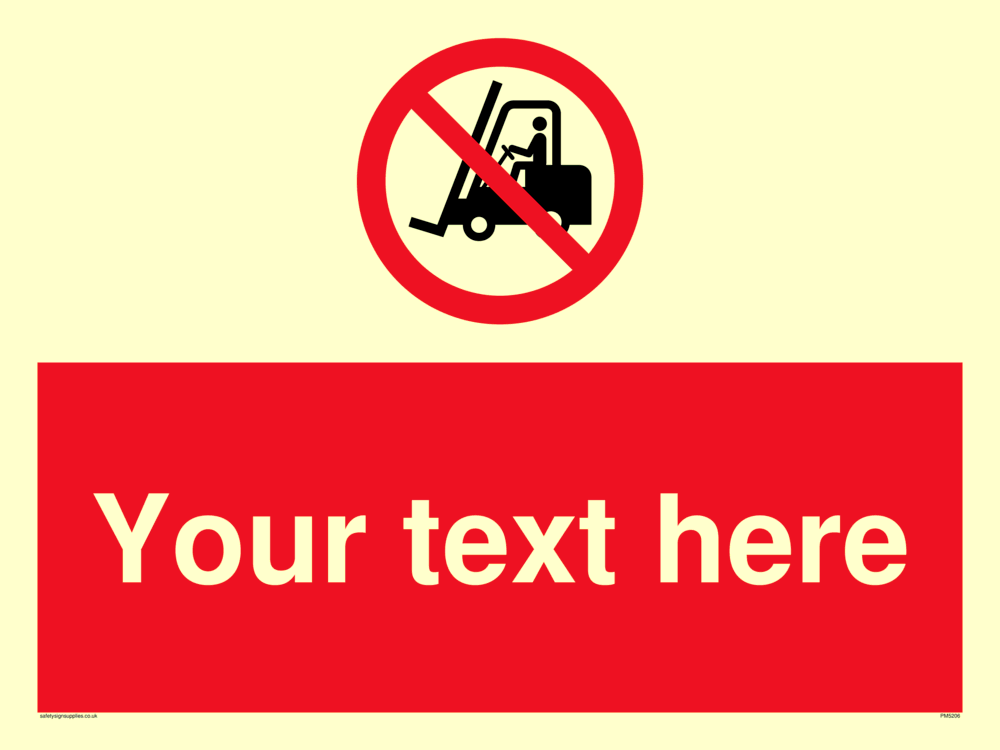 This sign contains a no fork lift trucks symbol - fork lift with red prohibition circle and line diagonally crossed through.