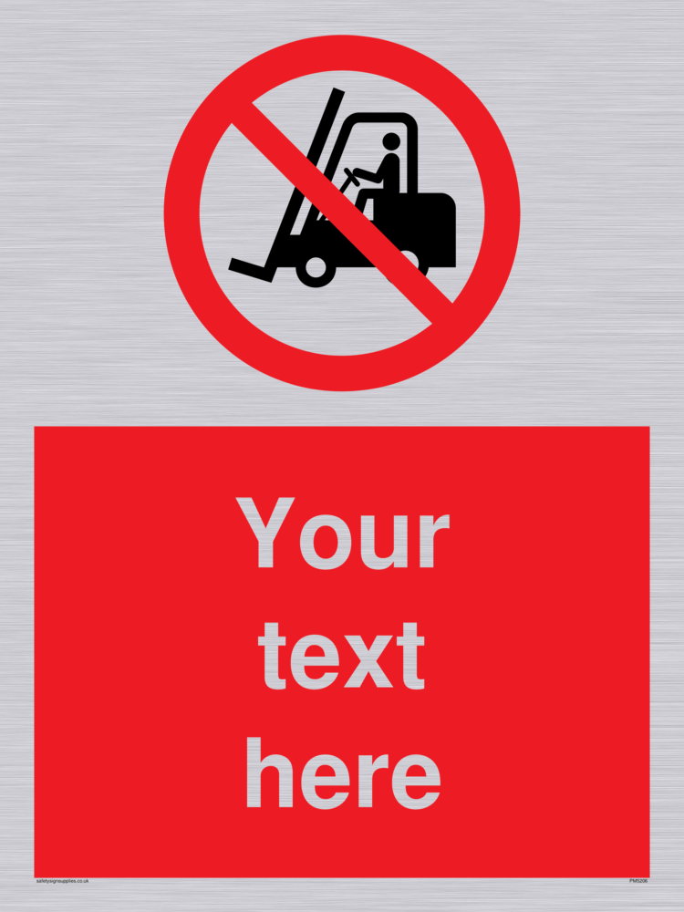 This sign contains a no fork lift trucks symbol - fork lift with red prohibition circle and line diagonally crossed through.