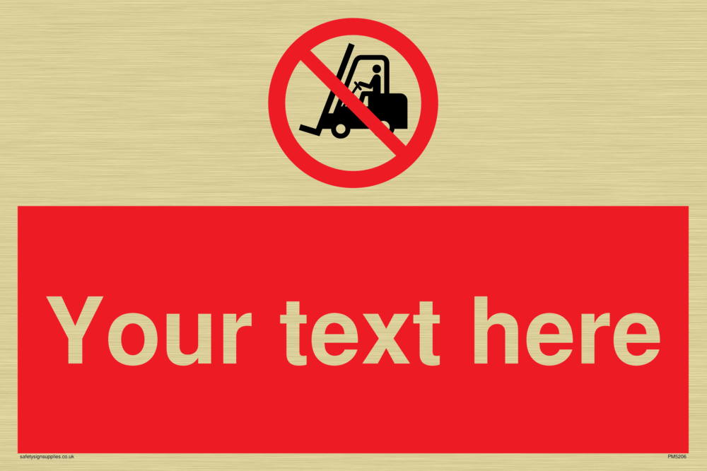 This sign contains a no fork lift trucks symbol - fork lift with red prohibition circle and line diagonally crossed through.