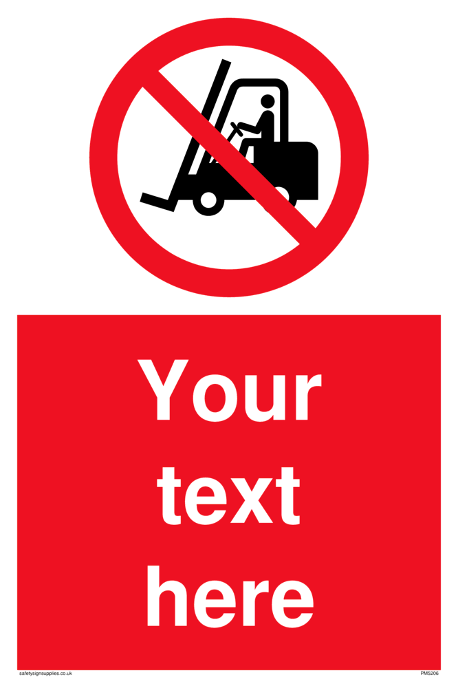 This sign contains a no fork lift trucks symbol - fork lift with red prohibition circle and line diagonally crossed through.