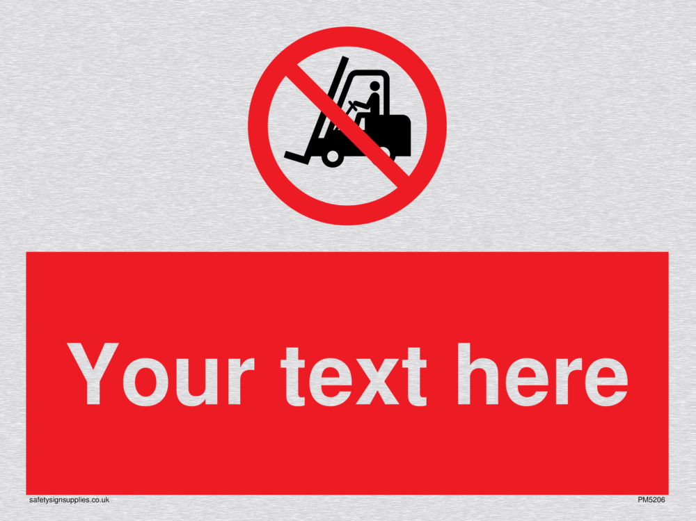 This sign contains a no fork lift trucks symbol - fork lift with red prohibition circle and line diagonally crossed through.