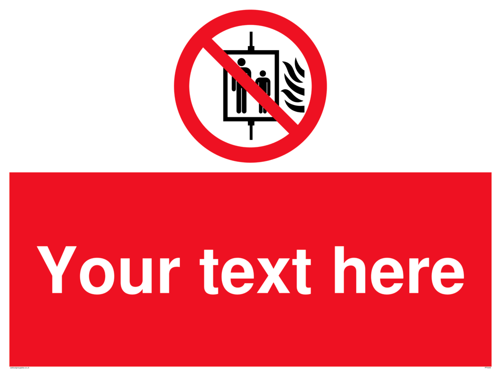 This sign contains a do not use lift symbol. Lift in black within red circle with diagonal line crossed through.