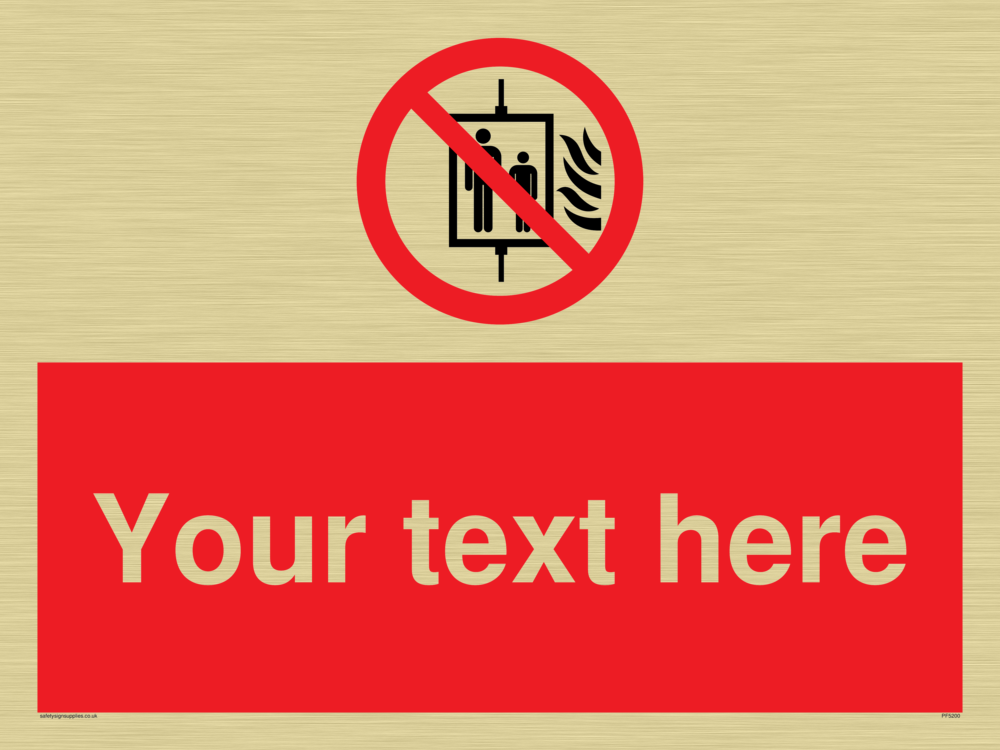 This sign contains a do not use lift symbol. Lift in black within red circle with diagonal line crossed through.