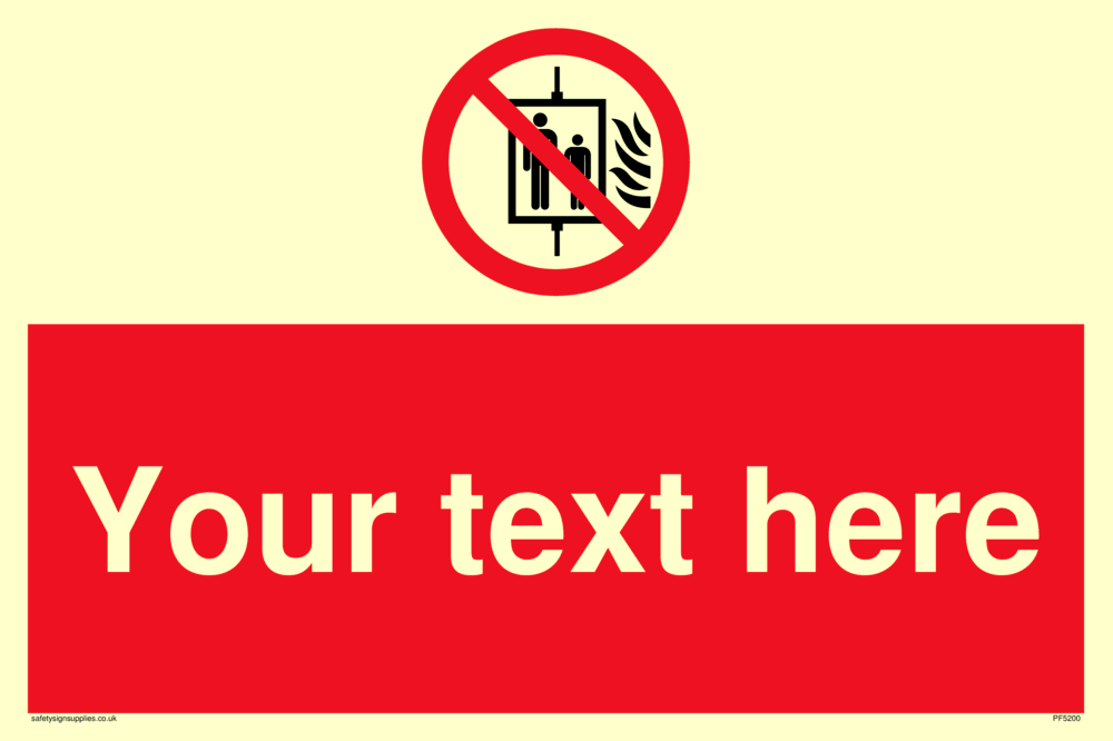 This sign contains a do not use lift symbol. Lift in black within red circle with diagonal line crossed through.