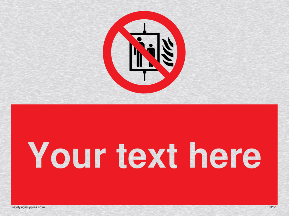 This sign contains a do not use lift symbol. Lift in black within red circle with diagonal line crossed through.