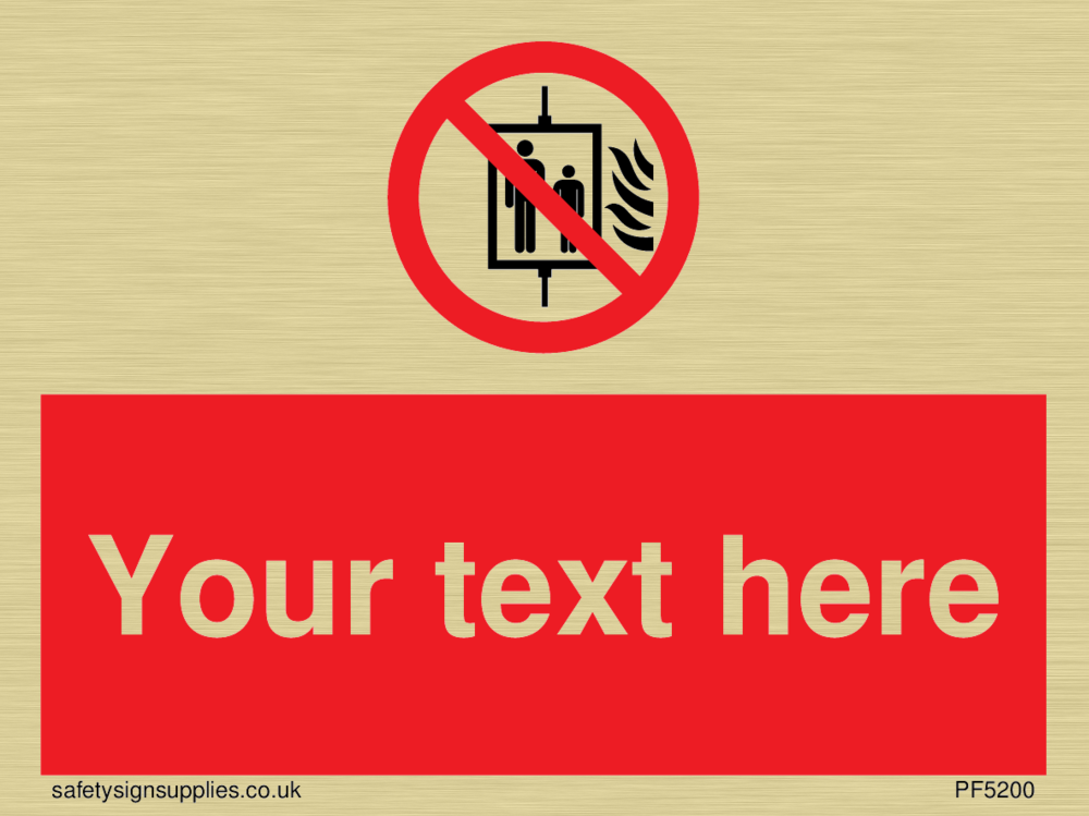 This sign contains a do not use lift symbol. Lift in black within red circle with diagonal line crossed through.