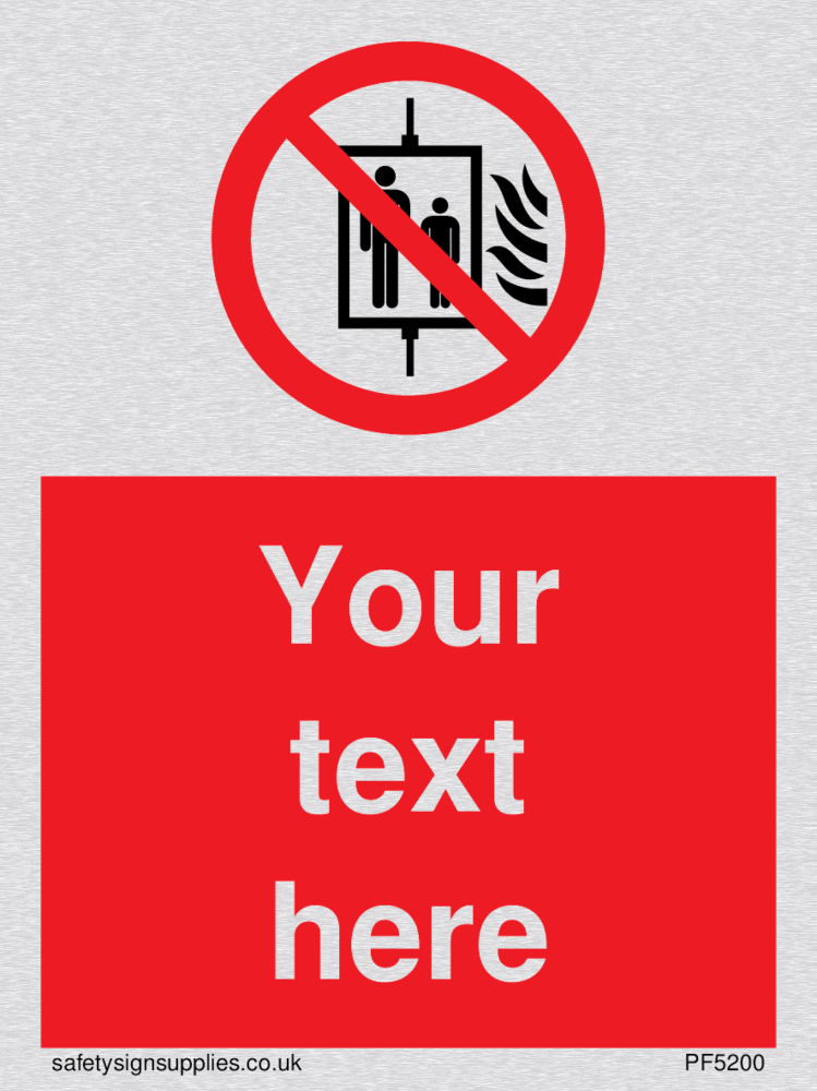 This sign contains a do not use lift symbol. Lift in black within red circle with diagonal line crossed through.