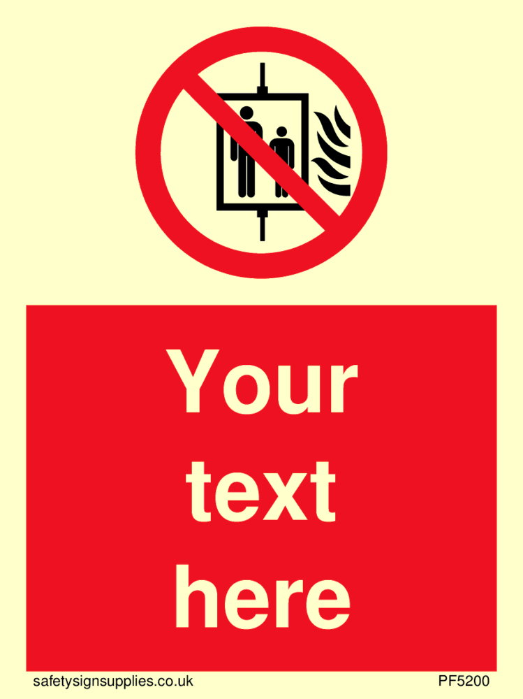 This sign contains a do not use lift symbol. Lift in black within red circle with diagonal line crossed through.