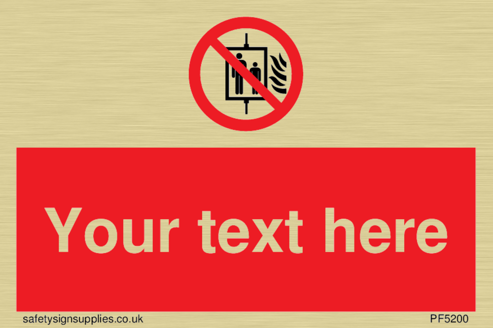 This sign contains a do not use lift symbol. Lift in black within red circle with diagonal line crossed through.