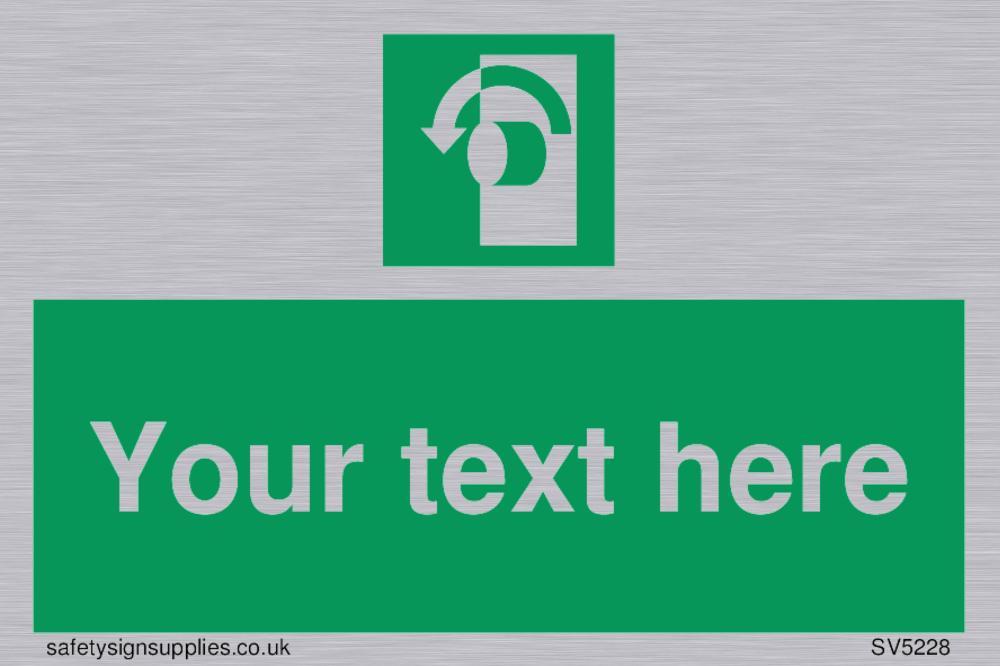 This sign contains a slide to open symbol - door in frame with arrow to one side in white on green background. Suitable for fixing with screws. Suitable for hanging with a premium hanging kit.