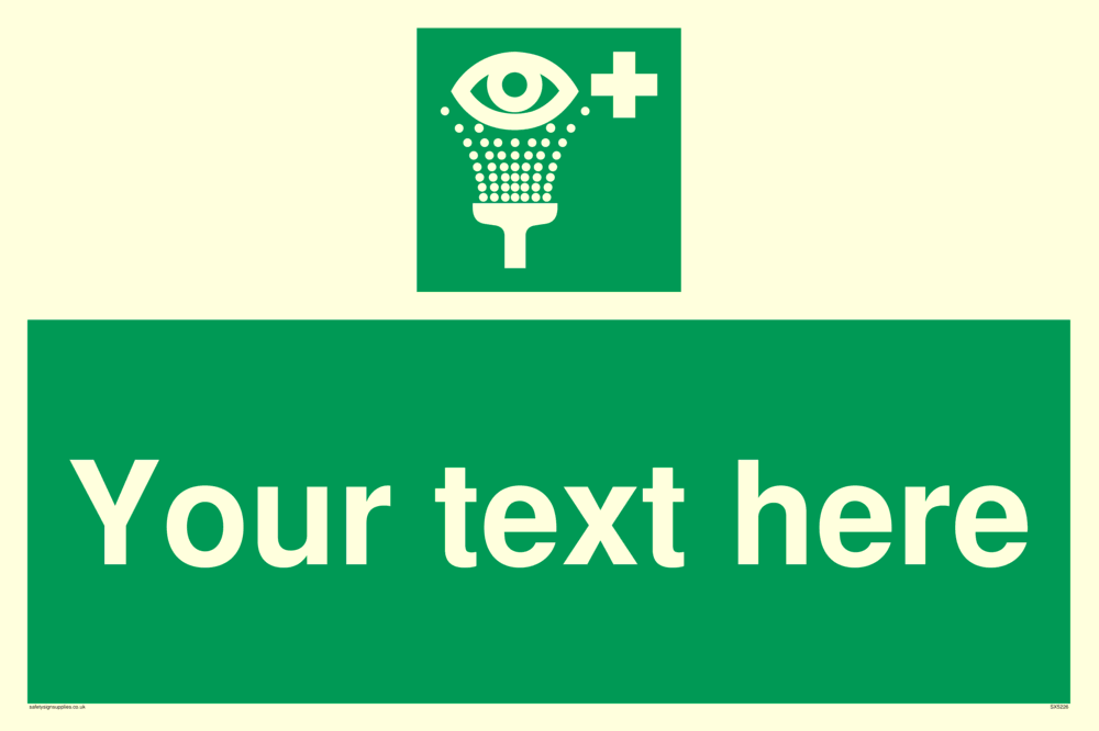 This sign contains an eye wash symbol - eye being washed in shower / spray in white on green background.