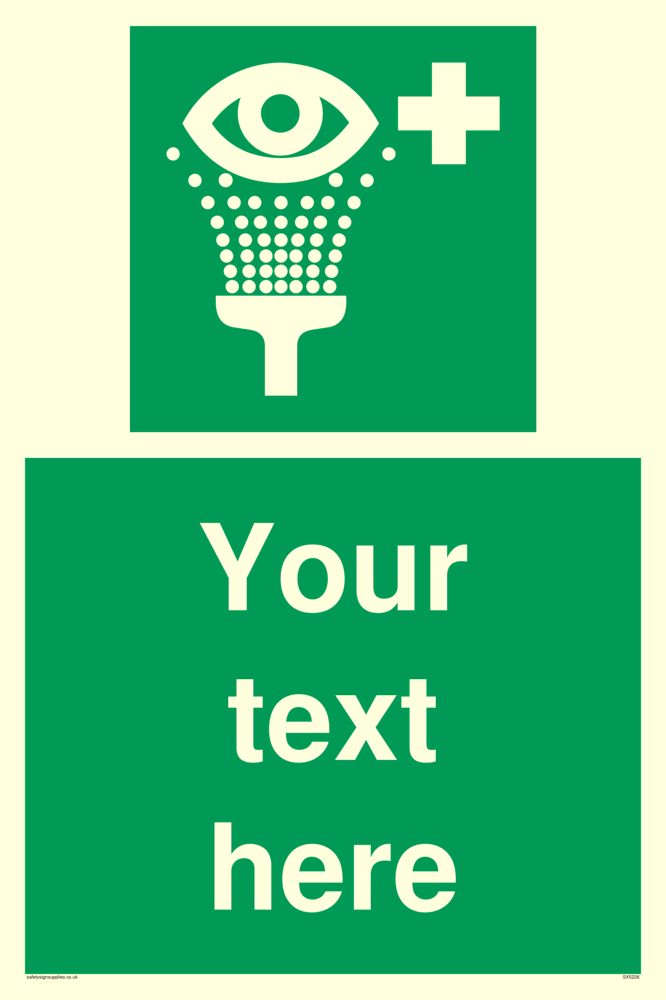This sign contains an eye wash symbol - eye being washed in shower / spray in white on green background.