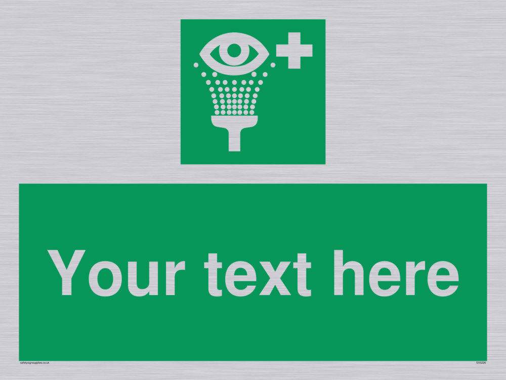 This sign contains an eye wash symbol - eye being washed in shower / spray in white on green background.