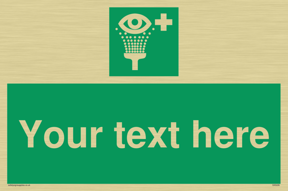 This sign contains an eye wash symbol - eye being washed in shower / spray in white on green background.