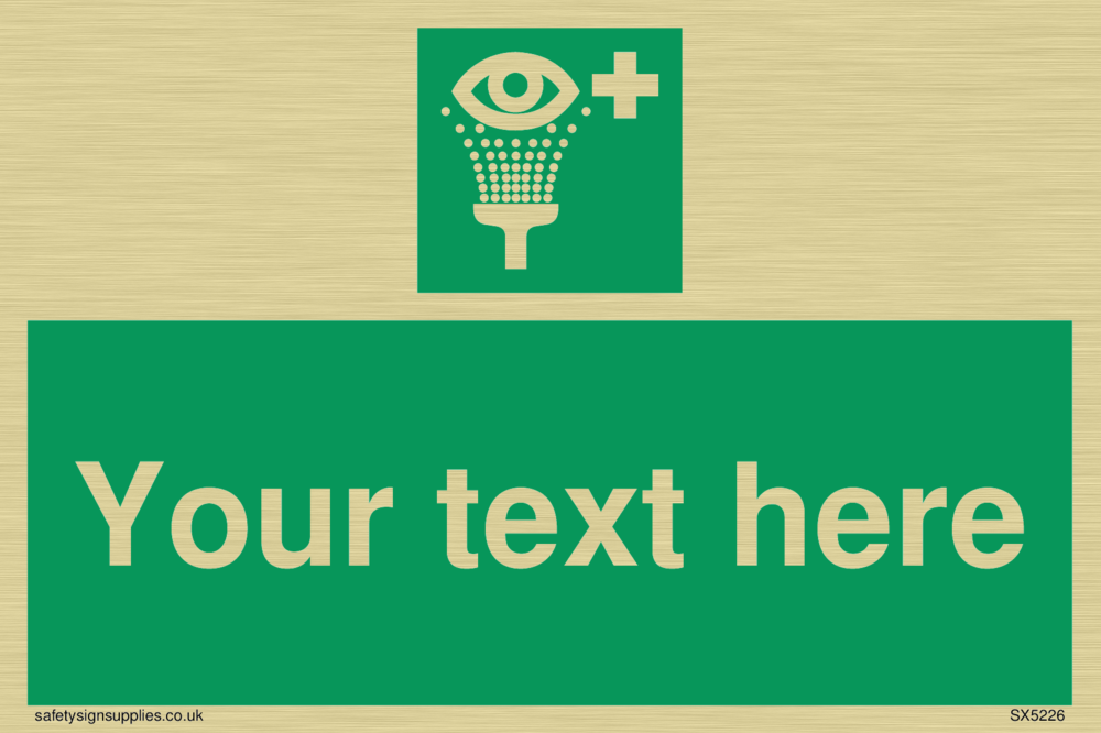 This sign contains an eye wash symbol - eye being washed in shower / spray in white on green background.