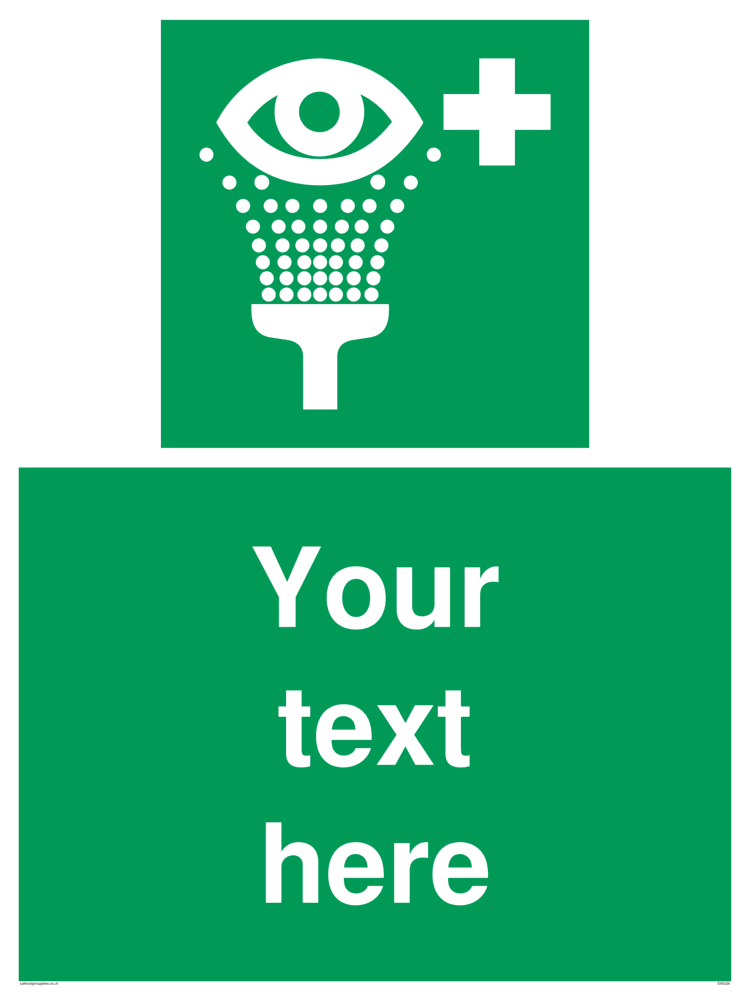 This sign contains an eye wash symbol - eye being washed in shower / spray in white on green background.