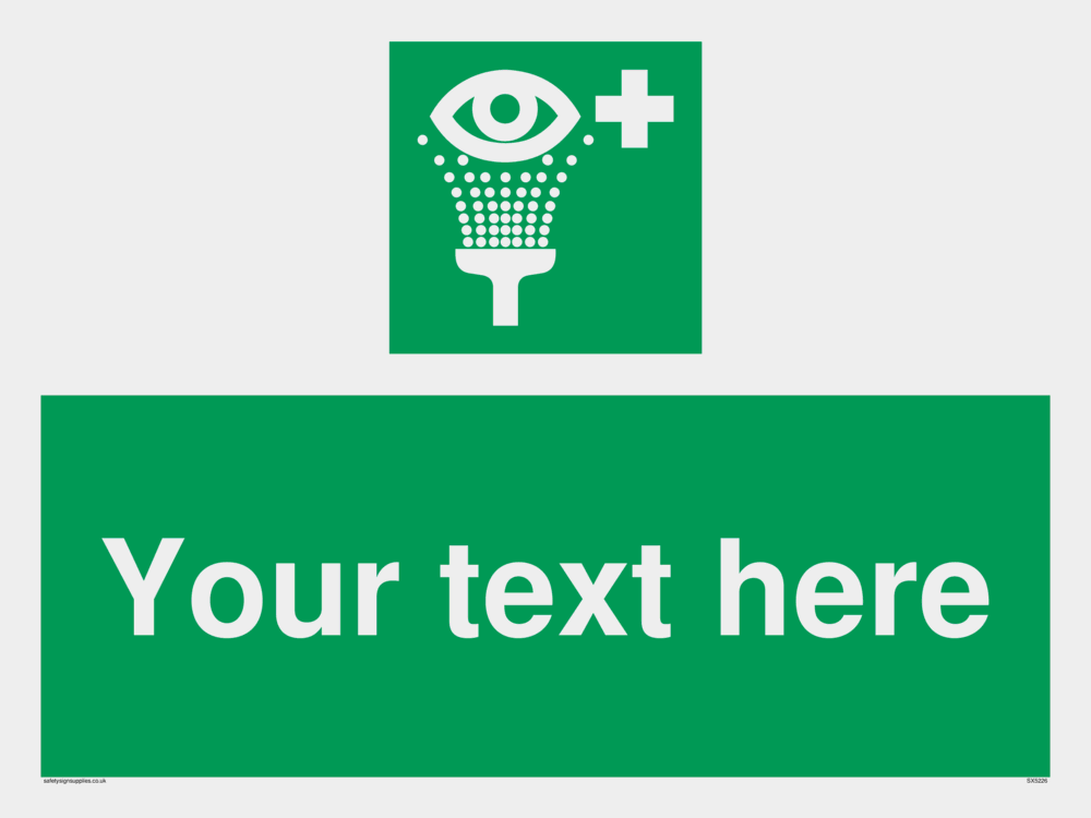 This sign contains an eye wash symbol - eye being washed in shower / spray in white on green background.