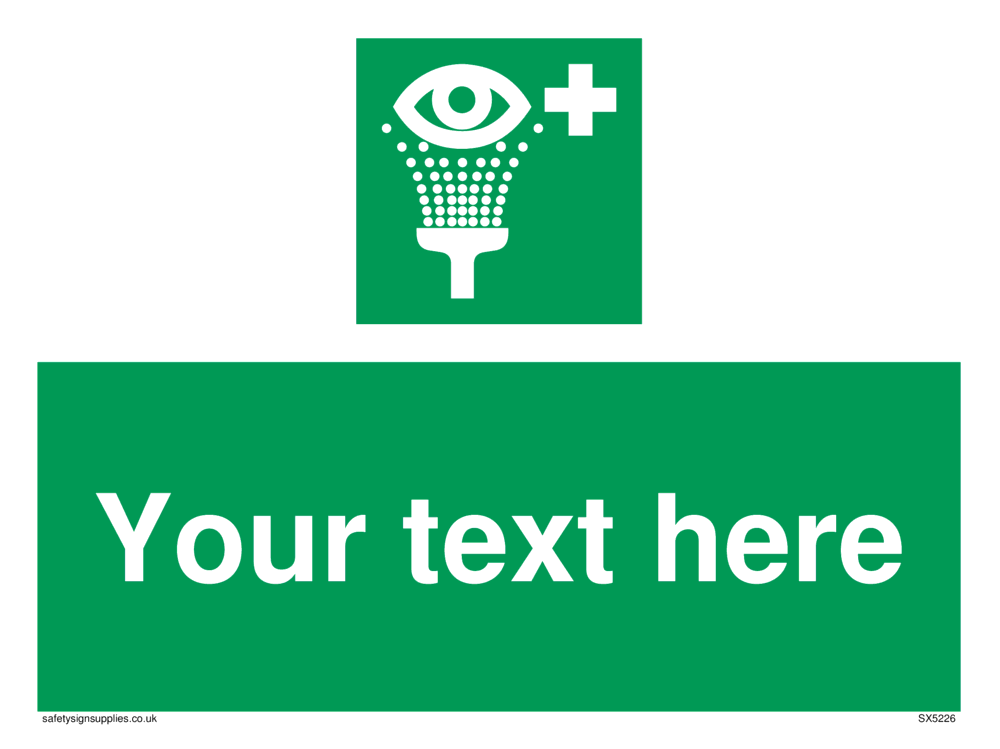 This sign contains an eye wash symbol - eye being washed in shower / spray in white on green background.