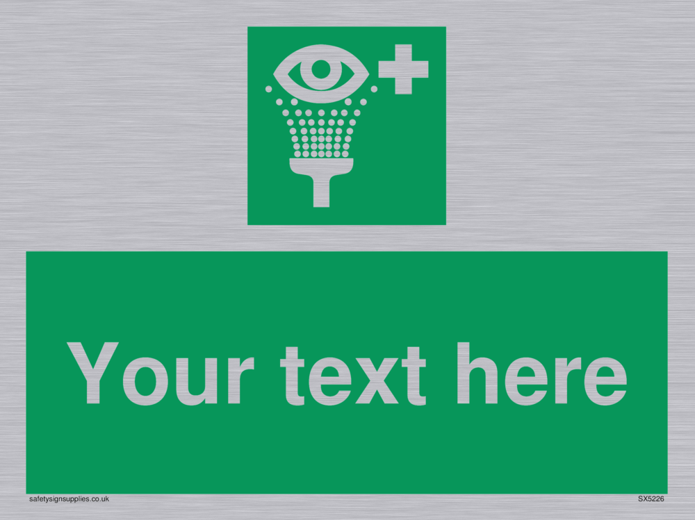 This sign contains an eye wash symbol - eye being washed in shower / spray in white on green background.
