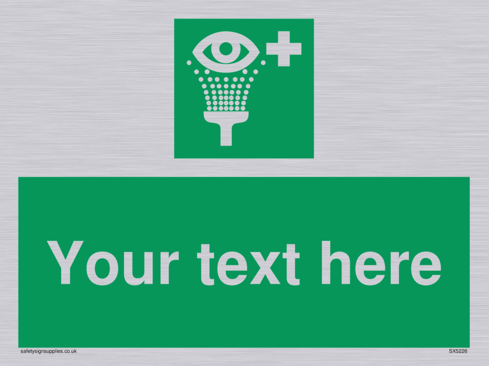 This sign contains an eye wash symbol - eye being washed in shower / spray in white on green background.