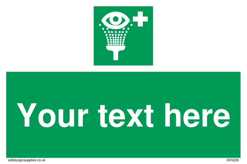 This sign contains an eye wash symbol - eye being washed in shower / spray in white on green background.