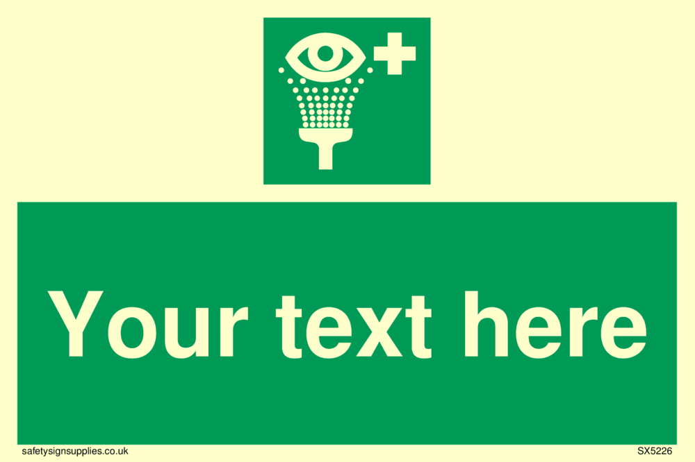 This sign contains an eye wash symbol - eye being washed in shower / spray in white on green background.