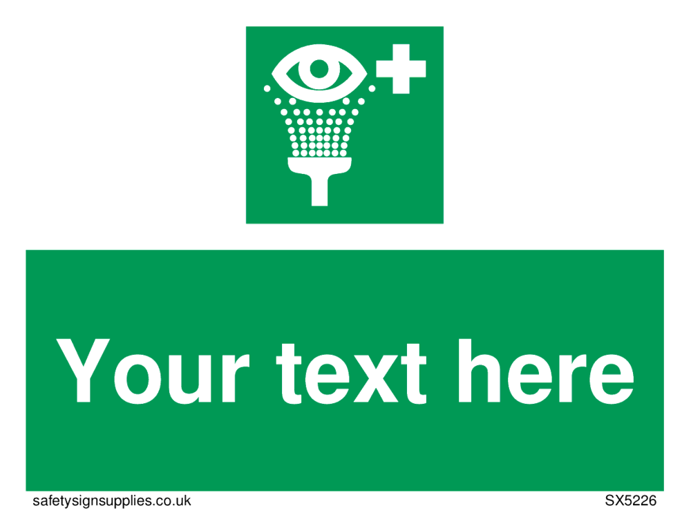 This sign contains an eye wash symbol - eye being washed in shower / spray in white on green background.