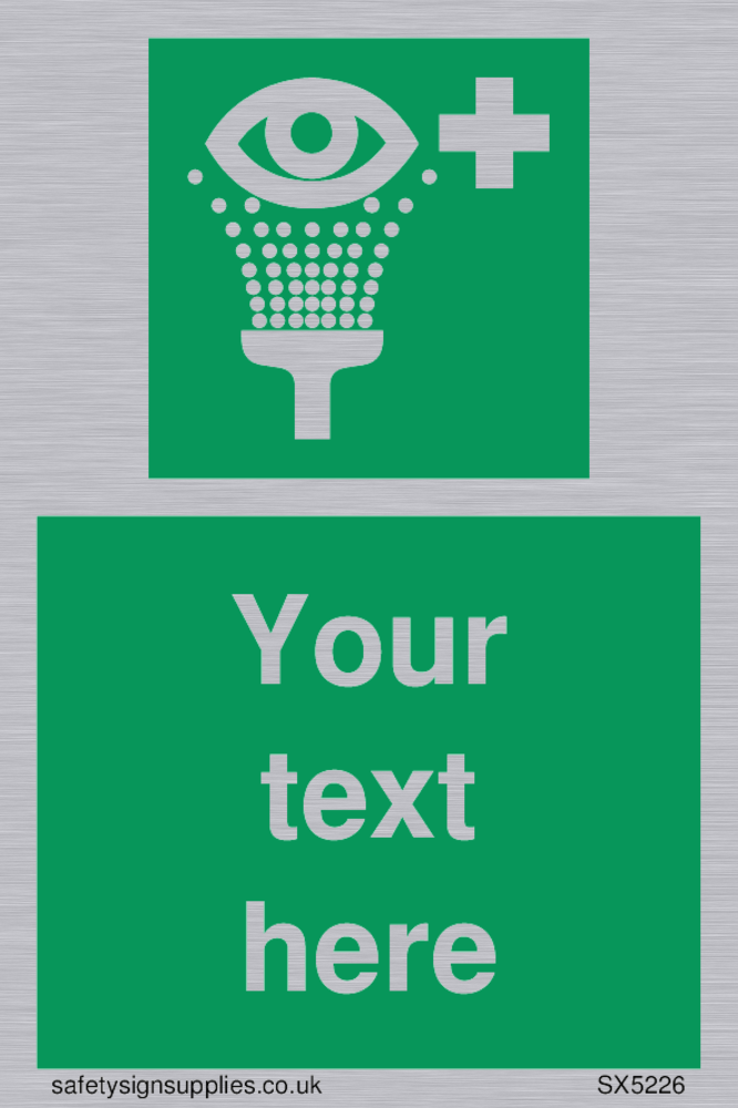 This sign contains an eye wash symbol - eye being washed in shower / spray in white on green background.