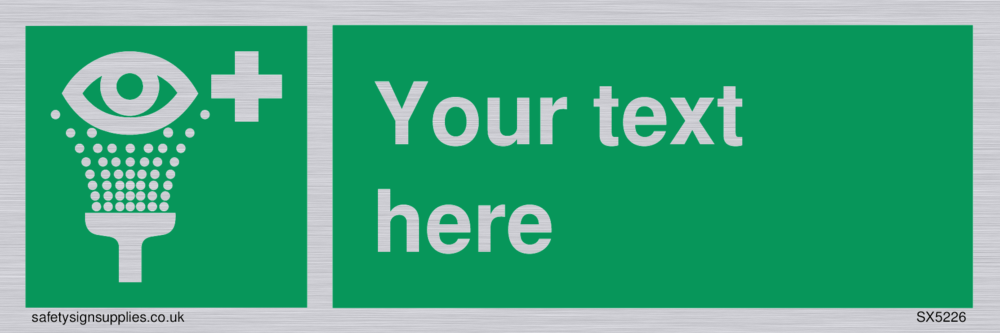 This sign contains an eye wash symbol - eye being washed in shower / spray in white on green background.