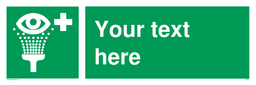 This sign contains an eye wash symbol - eye being washed in shower / spray in white on green background.