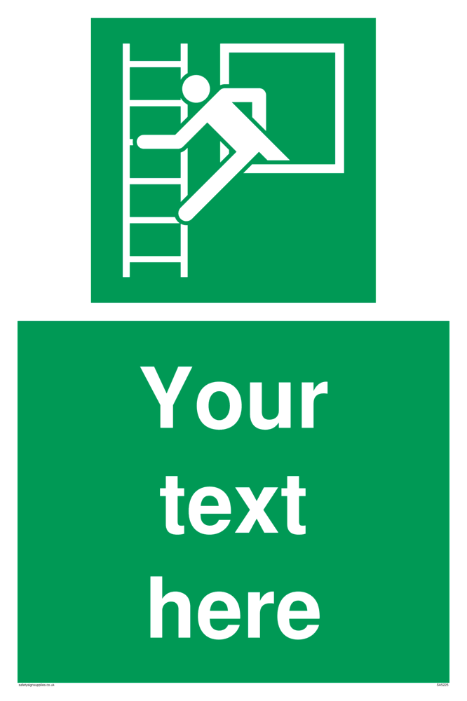 This sign contains an emergency escape ladder symbol - figure climbing out a window onto a ladder in white on green background.