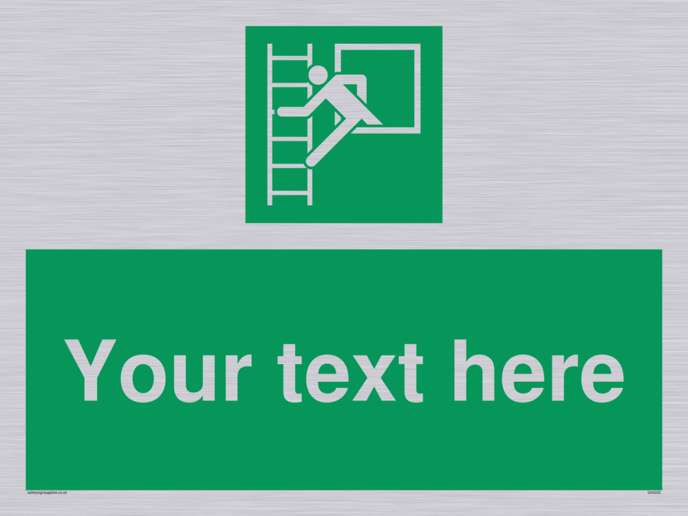 This sign contains an emergency escape ladder symbol - figure climbing out a window onto a ladder in white on green background.