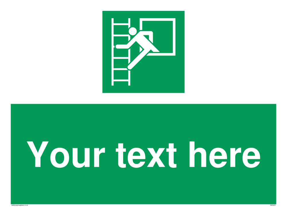 This sign contains an emergency escape ladder symbol - figure climbing out a window onto a ladder in white on green background.