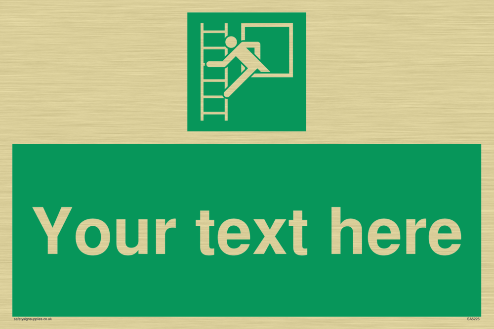 This sign contains an emergency escape ladder symbol - figure climbing out a window onto a ladder in white on green background.