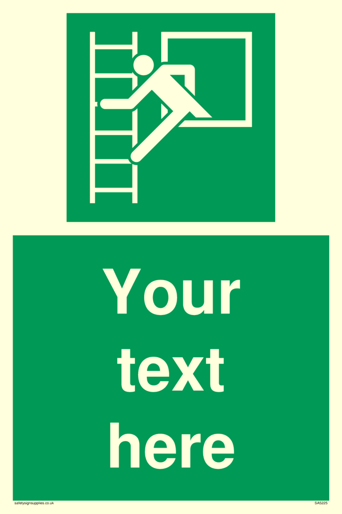 This sign contains an emergency escape ladder symbol - figure climbing out a window onto a ladder in white on green background.