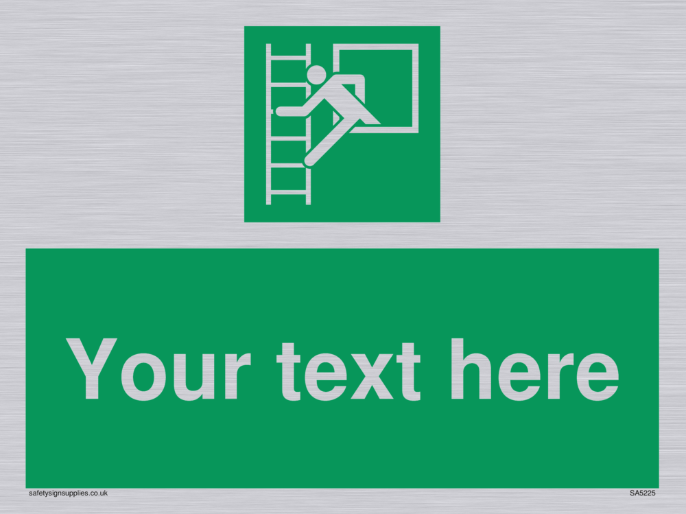 This sign contains an emergency escape ladder symbol - figure climbing out a window onto a ladder in white on green background.