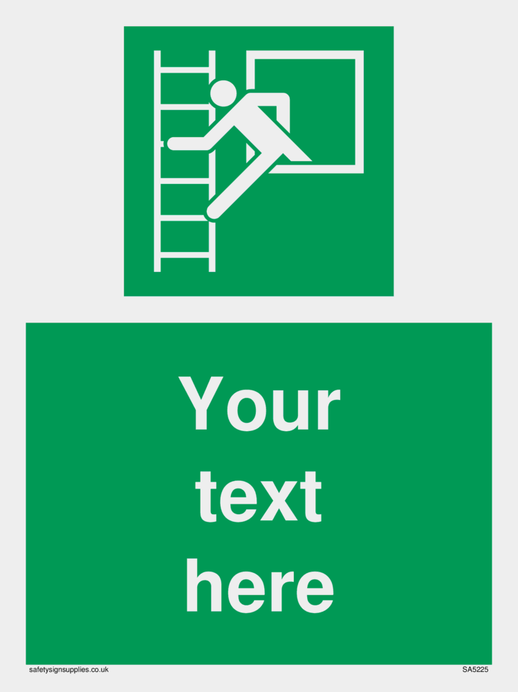 This sign contains an emergency escape ladder symbol - figure climbing out a window onto a ladder in white on green background.