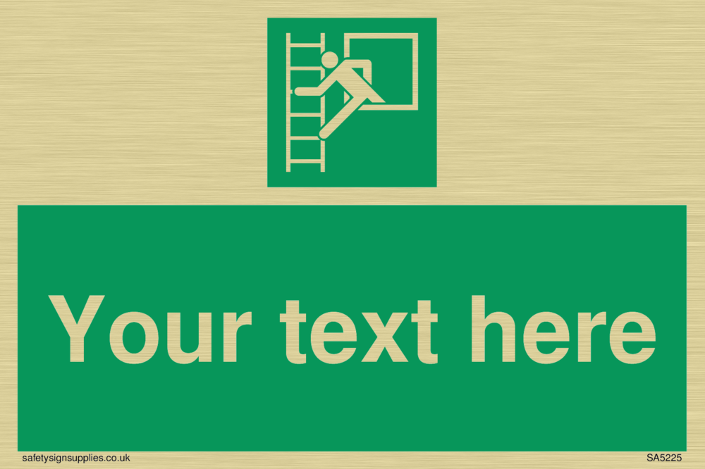 This sign contains an emergency escape ladder symbol - figure climbing out a window onto a ladder in white on green background.