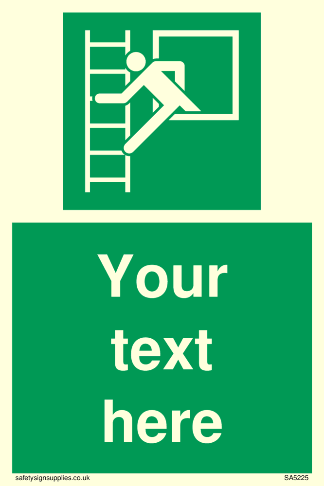 This sign contains an emergency escape ladder symbol - figure climbing out a window onto a ladder in white on green background.