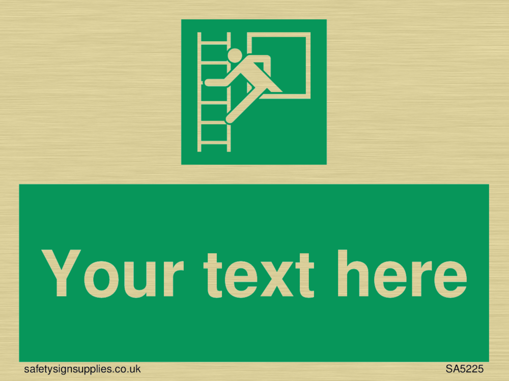 This sign contains an emergency escape ladder symbol - figure climbing out a window onto a ladder in white on green background.