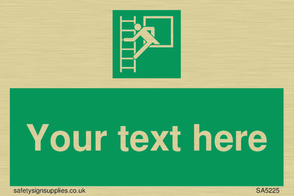 This sign contains an emergency escape ladder symbol - figure climbing out a window onto a ladder in white on green background.