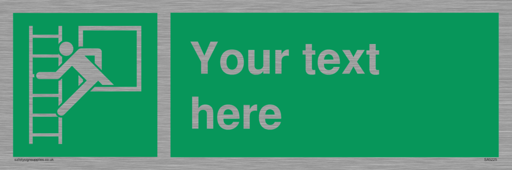 This sign contains an emergency escape ladder symbol - figure climbing out a window onto a ladder in white on green background.