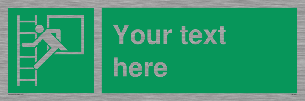 This sign contains an emergency escape ladder symbol - figure climbing out a window onto a ladder in white on green background.