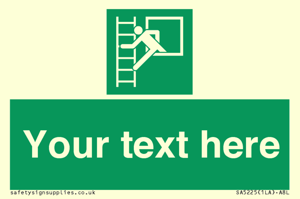 Thickness / Depth: 170microns Durability: 3-5 years Mounting Surface: flat Materials: Sticker Material Colour: Glow in the Dark Custom Text: Yes Language: ENGLISH Language (EN) Symbol: E016 : Emergency window with escape ladder Internal Layout: 1LA : 1 landscape pod in a Landscape Region: UK