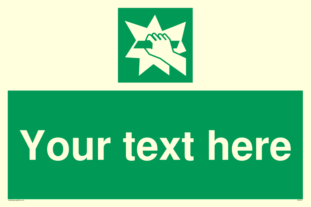 This sign contains a break glass symbol - hand breaking glass in white on green background.