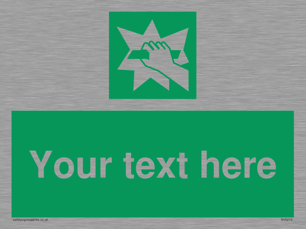 This sign contains a break glass symbol - hand breaking glass in white on green background.