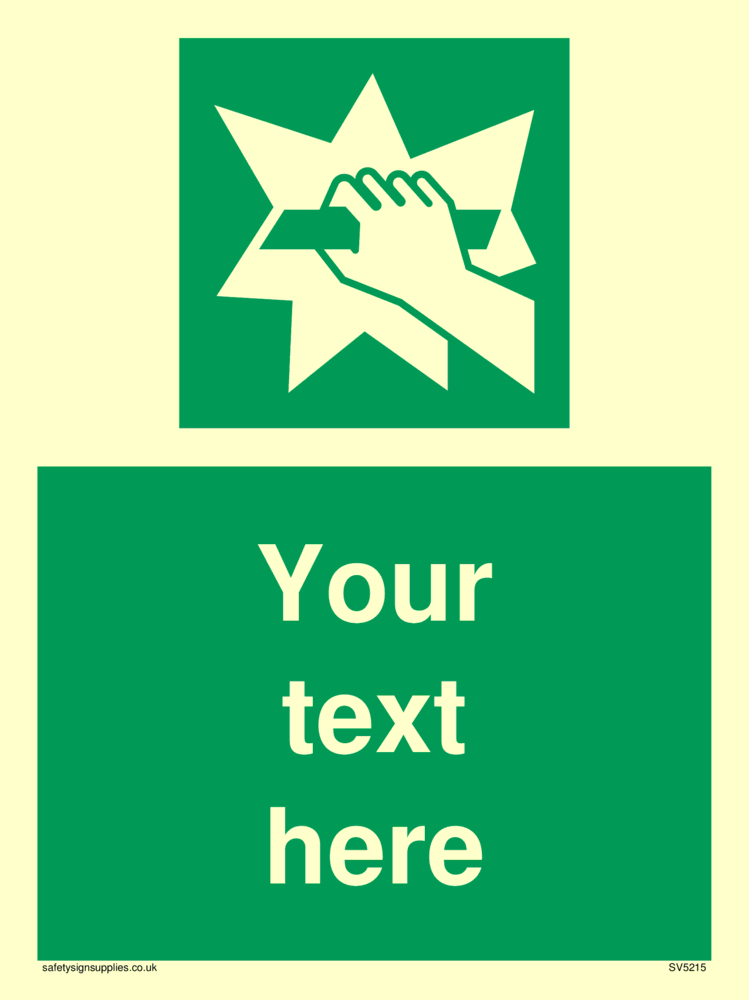 This sign contains a break glass symbol - hand breaking glass in white on green background.
