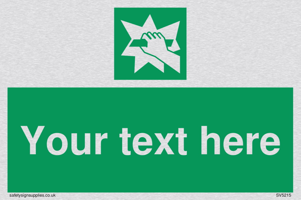 This sign contains a break glass symbol - hand breaking glass in white on green background.